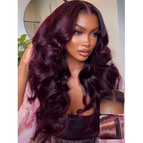 UNICE Black Cherry Body Wave 13×4 Lace Front Drawstring Wigs Human Hair with Face Framing Bangs Pre Everything Glueless Wig Human Hair Pre Plucked Pre Cut Bleached Knots for Women 16 inch
