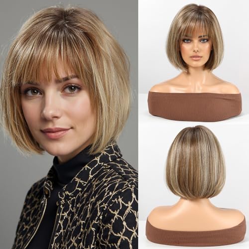 RSY 12 Inch Bob Wig Human Hair Blend Healthy Fiber Wigs for Women, Short Straight and Layered Wigs for Daily Wear, Hair Loss and Fashion Change(Brown Mixed Blonde Highlight)