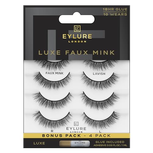 Eylure Luxe Faux Mink False Lashes – Natural Lavish, 4 Pairs Bonus Pack | Glue Included | 10 Wears