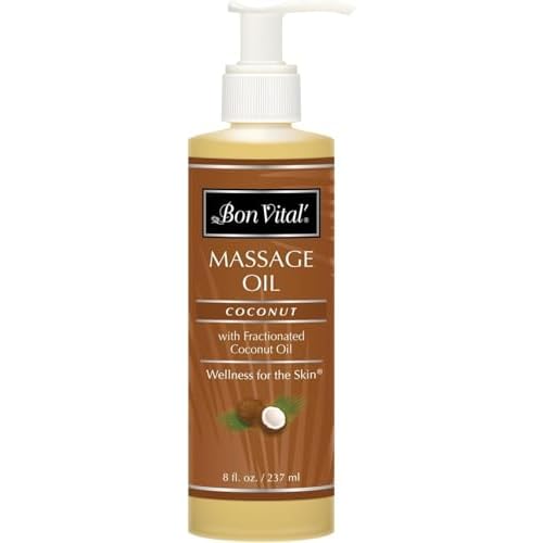 Bon Vital’ Coconut Massage Oil with 100% Pure Fractionated Coconut Oil to Repair Dry Skin, Used by Massage Therapists and At-Home Use for Therapeutic Massages and Relaxation, 8 Oz, Label may Vary