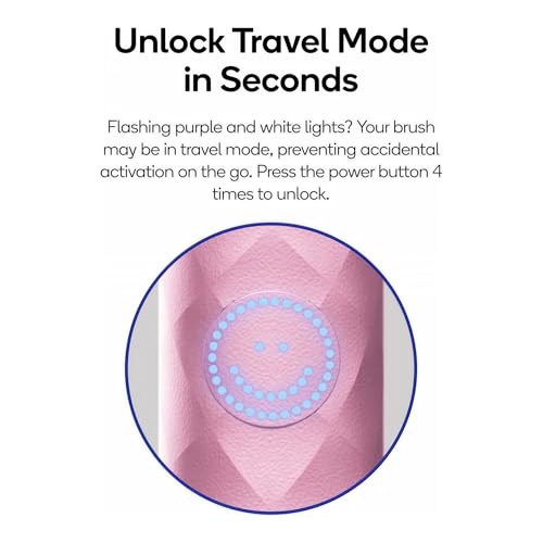 𝗨𝗡𝗟𝗢𝗖𝗞 𝗧𝗥𝗔𝗩𝗘𝗟 𝗠𝗢𝗗𝗘 𝗜𝗡 𝗦𝗘𝗖𝗢𝗡𝗗𝗦: Flashing purple and white lights? Your brush may be in travel mode, preventing accidental activation on the go. Press the power button 4 times to unlock.