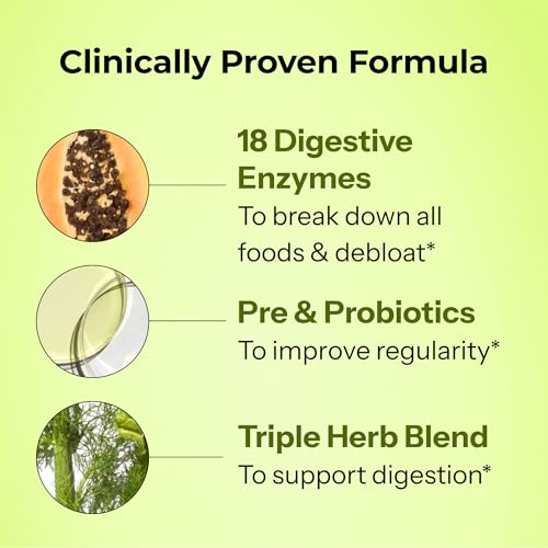 FAST-ACTING, 30 MINUTE DEBLOAT FORMULA: Support digestion and help with bloating with our blend of 18 full-spectrum digestive enzymes like lipase, amylase, and bromelain. These enzymes are designed to assist in breaking down proteins, carbs, fats, and fiber, promoting digestive health and providing support from bloating for women and men.