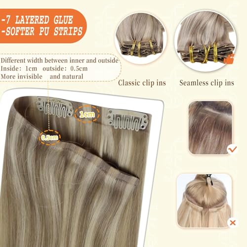 Full Shine Human Hair Clip in Extensions Balayage Seamless Hair Extensions Clip Ins Golden Blonde Mix Light Blonde Real Hair Extensions for Women Brazilian Hair 18 Inch 8 PCS 120 G