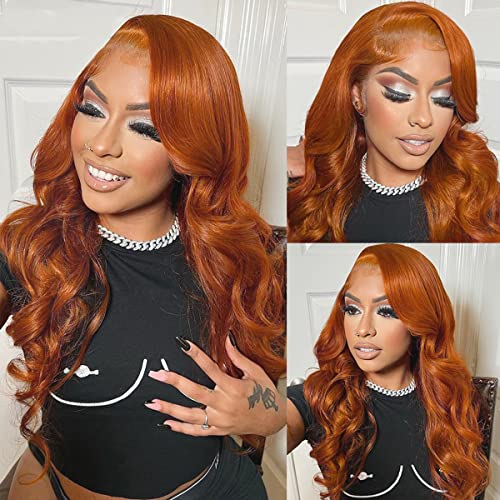 13X4 Dark Ginger Lace Front Wigs Human Hair Body Wave Orange Ginger Brown Brazilian HD Lace Front Human Hair Wigs Glueless 150% Density Pre Plucked Natural Hairline (18 inch, Copper Brown Color)