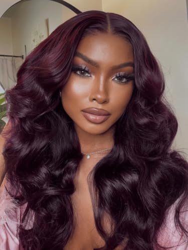 UNICE Black Cherry Body Wave 13×4 Lace Front Drawstring Wigs Human Hair with Face Framing Bangs Pre Everything Glueless Wig Human Hair Pre Plucked Pre Cut Bleached Knots for Women 16 inch