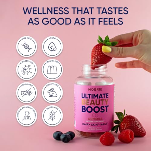 Wellness That Tastes as Good as It Feels! Upgrade Your Routine With Something You’ll Actually Enjoy — A Sweet Strawberry Biotin Gummies That Makes Beauty Support Fun Again. Packed With High-Potency Biotin, Vitamins C & E, and Clean Ingredients You Can Trust. Moerie Hair Nails and Skin Vitamins for Women and Men – Support Radiant Hair, Glowing Skin, and Strong Nails in the Most Delicious Way.