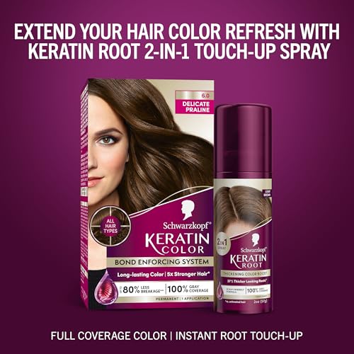 Say bye to faded color and grown out roots with the Schwarzkopf Keratin Color Permanent Hair Color, 6.0 Delicate Praline and Schwarzkopf Keratin Color Root Temporary Hair Color Spray, Light Brown bundle.