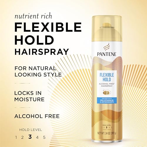 FLEXIBLE HOLD, NO CRUNCH Hair spray that supports your style, without sacrificing touchability. PANTENE Flexible Hold Alcohol-Free Hairspray offers Level 3, flexible control that lets hair move naturally while staying in place. HEALTHY HAIR TO THE LAST STEP This lightweight formula, with a blend of Pro-Vitamin B5 and antioxidants, helps tame frizz and add shine. Plus, it’s alcohol-free* formula locks in moisture, never drying out your hair. STYLE THAT MOVES No residue, no stickiness, no “helmet” feel—just a clean finish that lets natural texture shine. Whether you’re styling beachy waves, polished ponytails, or sleek strands, this spray locks in your look while caring for your hair. Bonus: the even-mist, alcohol-free formula delivers great results with less product, so a little goes a long way. HOW TO USE Shake well. Hold 8–10 inches from dry, styled hair and spray evenly. Layer for stronger hold or mist lightly for subtle control. *Contains no ethanol.