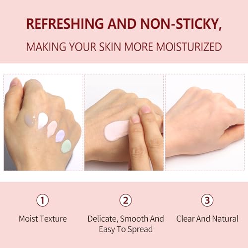 MULTIPLE CHOICES: 5 different primers are available for you to choose from, including 01# white, 02# pink, 03# purple, 04# green and 05# blue. White can brighten the skin tone and slightly cover pores and fine lines. Pink can make dull skin healthy and rosy. Purple can brighten and even out the skin tone. Green can even out the skin tone and modify redness. Blue can moisturize and hydrate.