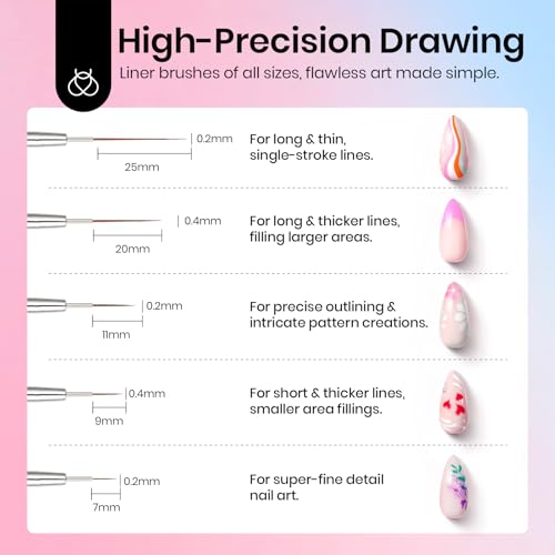 【Premium & Easy to Handle】Made with quality fiber, non-deformation, non-corroding. The UV gel nail brush assembled with strong glue between fiber and metal tubes, that is durable and can’t shedding from the brush stick to your nails. And the nail art brushe’s pen body is lightweight and comfortable, very easy to hold and paint! Let you easily create your favorite patterns!