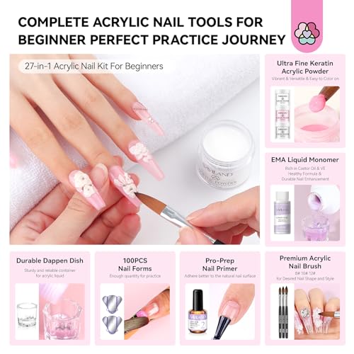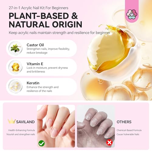 Beginner Acrylic Nail Kit: Saviland all-in-1 acrylic nail starter kit is designed for beginners, featuring 3pcs ultra-fine acrylic powders, EMA acrylic liquid monomer, size 8/10/12 acrylic nail brushes, nail dappen dish, 5pcs gel nail polish, nail primer, 100 nail forms & tips, nail drill with bits, nail lamp, and various necessary nail art accessories. Suitable for creating salon-quality acrylic nails at home effortlessly!