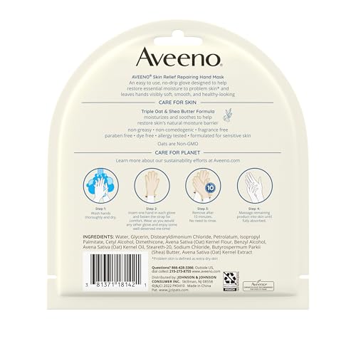 Help heal very dry skin with Aveeno Skin Relief Repairing Hand Masks, single use, no drip moisturizing gloves. These skin relief gloves are enriched with shea butter & moisturizing prebiotic oat–known to have nourishing properties–to help restore essential moisture to extra-dry skin, leaving your hands visibly soft, smooth, & healthy-looking. The hand mask gloves are designed to help restore essential moisture to problem skin,* and are infused with a unique formula that helps balance skin’s natural moisture barrier. The non-comedogenic gloves for hand care are easy to use: simply wash & dry your hands, wear the gloves for approximately 10 minutes, & remove–no need to rinse. The non-greasy hand care masks are designed to care for dry, sensitive skin & are formulated free of fragrance, parabens & dyes. Give your dry hands some much needed relief with moisturizing hand masks from Aveeno, a dermatologist recommended brand for over 70 years.